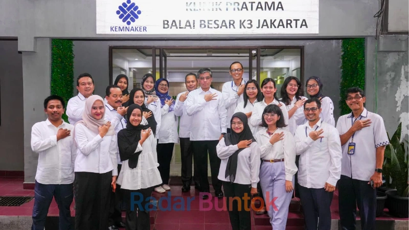 Menteri Ketenagakerjaan bersama jajaran Balai Besar K3 Jakarta berfoto usai peninjauan, menegaskan komitmen penguatan keselamatan dan kesehatan kerja di Indonesia (foto: Radar Buntok/Biro Humas Kemnaker)